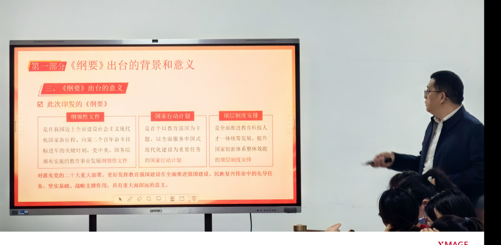 在专题学习环节,张鹏副书记带领全体参会人员深入学习了《教育强国建设规划纲要(2024-2035年)》部分内容。该纲要为我国教育强国建设绘制了宏伟蓝图,涵盖从学前教育到高等教育的全方位规划,强调了教育公平、质量提升、产教融合等关键领域的改革与发展方向,对学校未来的发展具有重要指导意义。通过深入解读,教师们进一步明确了教育强国建设的目标与任务,深刻认识到自身在培养德智体美劳全面发展的社会主义建设者和接班人中的重要使命。