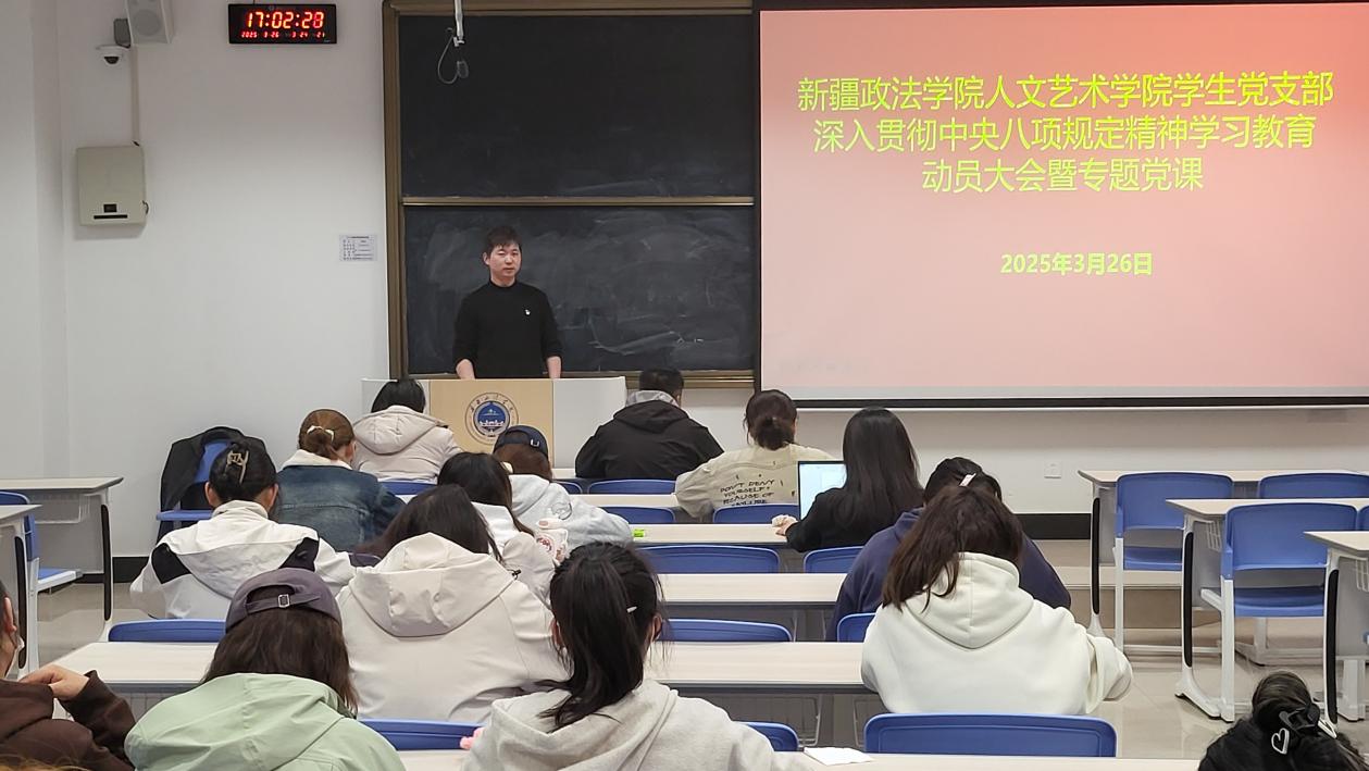3月26日,437必赢会员中心学生党支部在2722教室开展深入贯彻中央八项规定精神学习教育动员大会暨专题党课,党支部书记景路恒主持会议,各支委及全体党员参加。