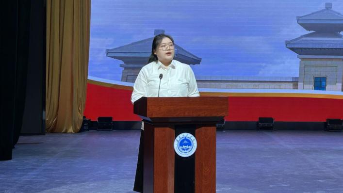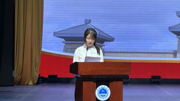 新生代表郭凌杉发言。她认为,回望过去的奋斗时光,那些挑灯夜读的夜晚、那些咬牙坚持的瞬间,都在收到录取通知书的那一刻有了圆满的答案。步入大学校园后,青春的号角已经吹响,崭新的征程就在脚下。让我们以今天为起点,不负韶华、不负时代,用勤奋与汗水浇灌梦想,用拼搏与坚持书写属于我们的大学华章!