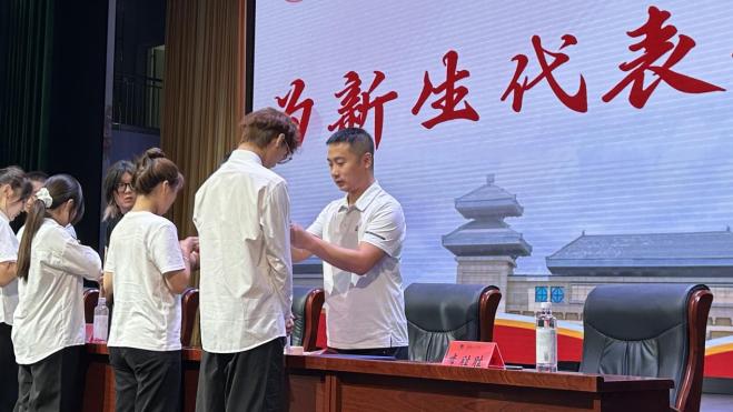 随后,院领导为各系新生代表佩戴校徽,全体新生凝神注视校徽,深刻铭记“明德尚法、兴疆固边”的校训内核。