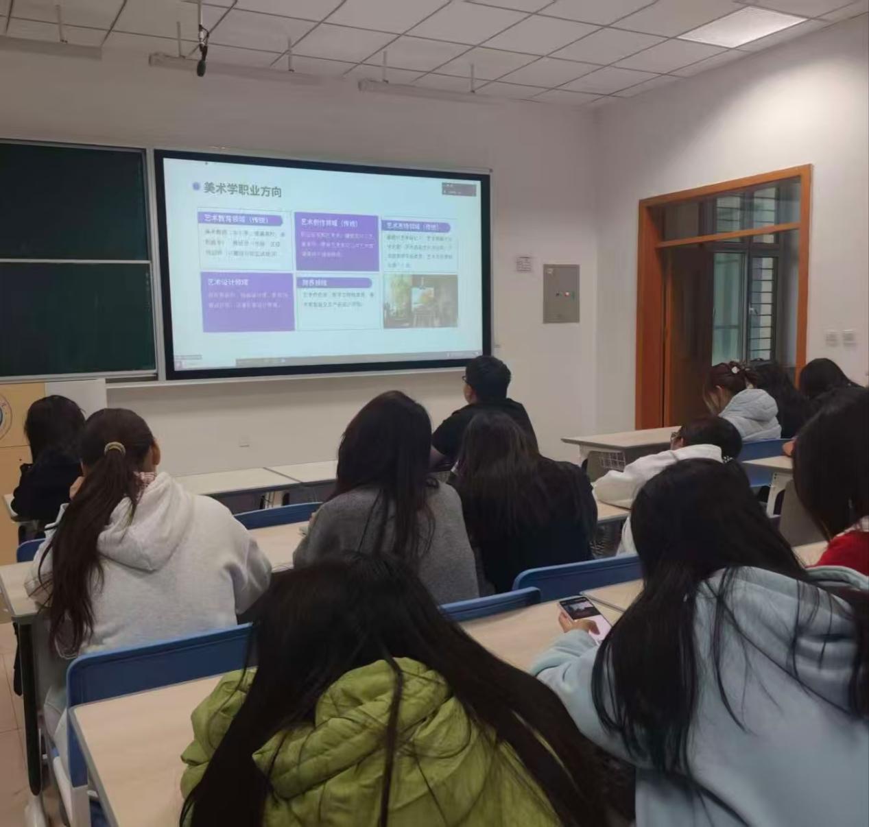 在美术学专业课程培养目标上,曹仁宇老师在专业门类以及专业培养目标等方面,向学生们传达在专业课的学习中要培养自己的能力,发现自己所感兴趣所喜欢的专业,在学业之余拓展自己的能力,鼓励学生们参加“大创”“创新创业”比赛丰富经验,同时也要关注社会信息以及发展趋向,不能两耳不闻窗外事。